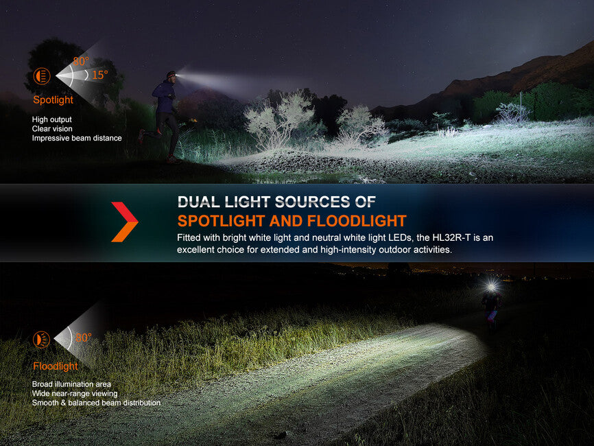 La lampada frontale ricaricabile Fenix HL32R-T presenta un design leggero e unico a doppio riflettore. Il riflettore principale produce un fascio di luce ben focalizzato con 800 lumen e una portata fino a 132 metri. Il secondo riflettore, da 200 lumen, ha un percorso di luce molto ampio e regolare con una portata di 30 metri, oltre a una tonalitá di luce più calda (bianco neutro). Il vantaggio di questa tonalitá di luce é una resa cromatica più naturale e contrastante, non solo in natura. Il controllo dei due LED é indipendente l'uno dall'altro (i coni non possono però essere combinati). L'alimentazione é fornita da una singola batteria agli ioni di litio ARB-LP1900 con una capacitá di 1900 mAh, che é inclusa nella confezione e si ricarica tramite un moderno connettore USB-C direttamente nella lampada frontale. La batteria può essere rimossa e sostituita con tre normali batterie AAA in caso di emergenza (tuttavia, queste non possono essere ricaricate nella lampada).