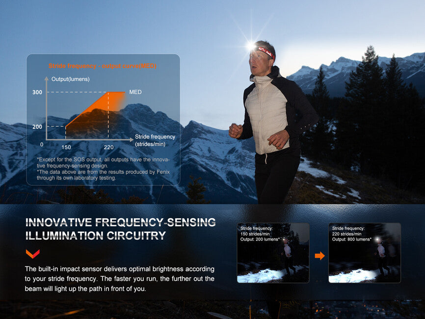 - Frequenza di passo sensibile: la luminositá si adatta automaticamente alla velocitá di corsa.